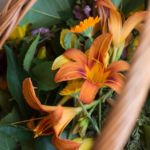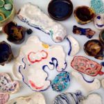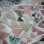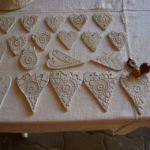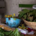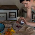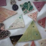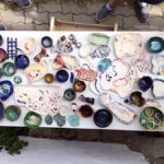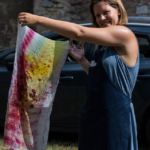 reggeli után komoly munka, kerámia mellett textilfestés is elindul. forró víz, lábosok, virágok: búzavirág, rózsaszirom, falevél- mogyoró, dió, borostyán, gingko biloba, rózsaág.
